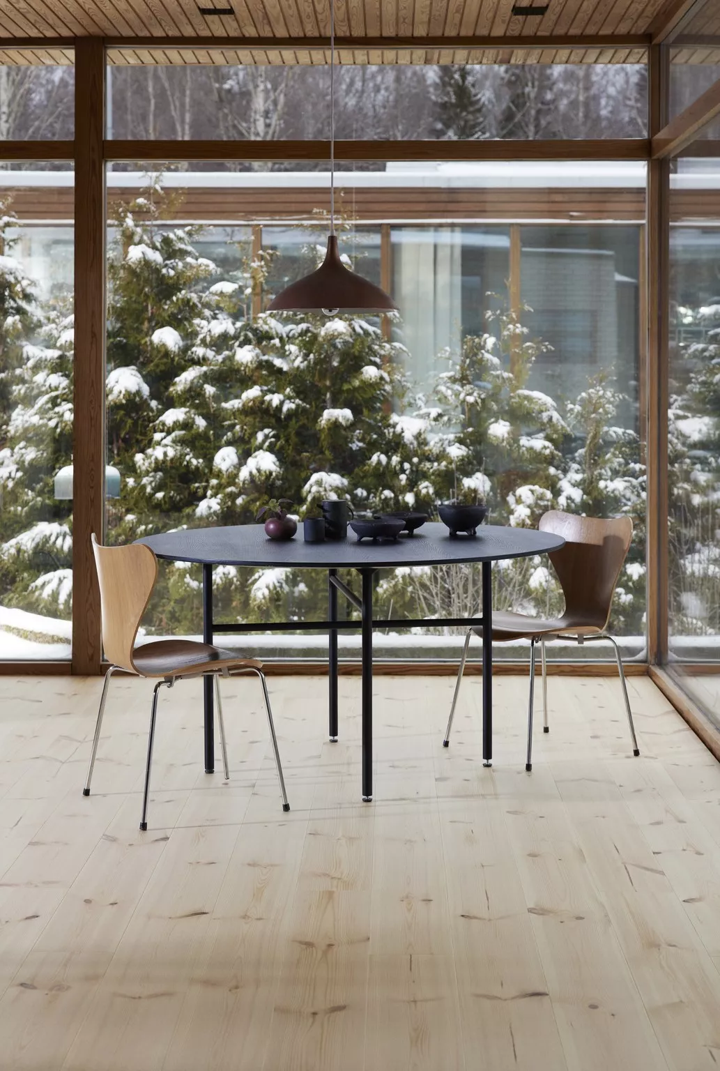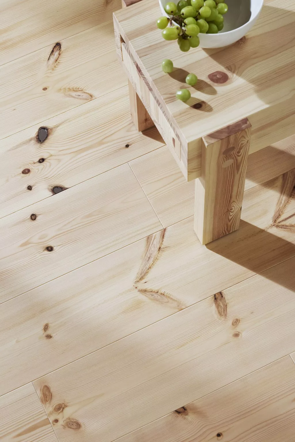 Jasny, ciepły odcień sosny optycznie rozjaśnia wnętrze i ułatwia dobór dodatków. Surowa deska sosnowa podłogowa daje dużą swobodę wykończenia – można ją polakierować, zaolejować, zaimpregnować lub pomalować. Każde z tych rozwiązań zabezpiecza drewno, a przy okazji podkreśla słoje i sęki.